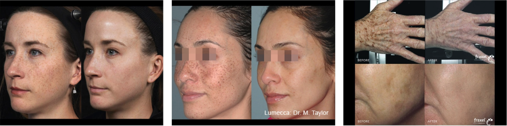 A variety of treatment options are available according to the individual pigment problem, including sun blocks, specialised skin care products, prescription vitamin A creams (retinoids), prescription lightening creams, glycolic acid products, chemical peels, microdermabrasion, hydrafacials, cryotherapy/ freezing (using liquid nitrogen), microneedling and lasers. The most dramatic and rapid improvement is achieved with the PicoWay® laser, Intense Pulsed Light or Fraxel® lasers, in particular the Fraxel® Restore laser with Dual wavelengths (1550nm and 1927nm).